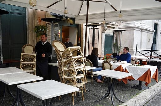 Waiters pile up chairs and prepare to close, according to the Italian government measures to slow down the diffusion of the new Coronavirus, at an hour when normally they warm up for the maximum affluence of customers, in Rome's Piazza Navona, Tuesday, March 10, 2020. For most people, the new coronavirus causes only mild or moderate symptoms, such as fever and cough. For some, especially older adults and people with existing health problems, it can cause more severe illness, including pneumonia. (AP Photo/Andrew Medichini)