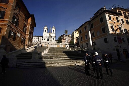 Italian municipality police stand by empty Spanish Steps, in Rome, Tuesday, March 10, 2020. Italy entered its first day under a nationwide lockdown after a government decree extended restrictions on movement from the hard-hit north to the rest of the country to prevent the spreading of coronavirus. (AP Photo/Andrew Medichini)