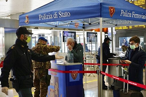Border police check travelers documents at a check point inside Rome's Termini train station, Tuesday, March 10, 2020. In Italy the government extended a coronavirus containment order previously limited to the country’s north to the rest of the country beginning Tuesday, with soldiers and police enforcing bans. (AP Photo/Andrew Medichini)