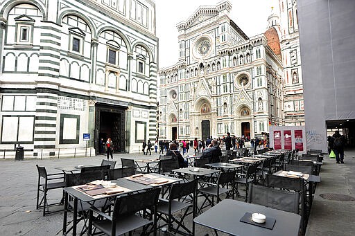 A cafe' is empty in Piazza del Duomo square, in Florence, Italy, Tuesday, March 10, 2020. Italy entered its first day under a nationwide lockdown after a government decree extended restrictions on movement from the hard-hit north to the rest of the country to prevent the spreading of coronavirus. (Jennifer Lorenzini/LaPresse via AP)