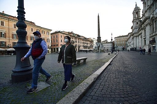Two people walk in Rome's Piazza Navona, deserted, Tuesday evening, March 10, 2020. For most people, the new coronavirus causes only mild or moderate symptoms, such as fever and cough. For some, especially older adults and people with existing health problems, it can cause more severe illness, including pneumonia. (AP Photo/Andrew Medichini)