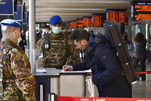A traveler fills out a form at a check point set up by border police inside Rome's Termini train station, Tuesday, March 10, 2020. In Italy the government extended a coronavirus containment order previously limited to the country’s north to the rest of the country beginning Tuesday, with soldiers and police enforcing bans. (AP Photo/Andrew Medichini)