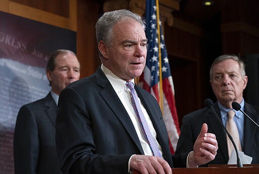 Sen. Tim Kaine, D-Va., center, joined at by Sen. Tom Udall, D-N.M., left, and Sen. Dick Durbin, D-Ill., speaks to reporters after the Senate voted to approve a bipartisan measure limiting President Donald Trump's authority to launch military operations against Iran, at the Capitol in Washington, Thursday, Feb. 13, 2020. (AP Photo/J. Scott Applewhite)
