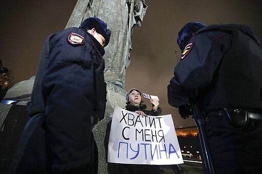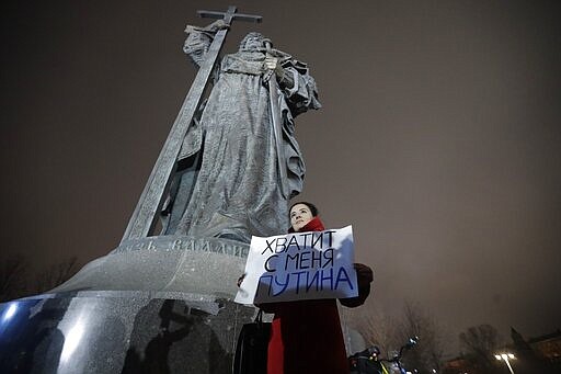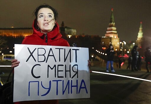 A protester holds a poster that reads: "Enough Putin for me" as she stages a one-man protest in front of the monument of Prince Vladimir next to the Kremlin in Moscow, Russia, Wednesday, March 11, 2020. The constitutional reform passed by the Duma on Wednesday would allow Putin to run for presidency two more times after 2024. Before the national vote, it will be reviewed by Russia's Constitutional Court. (AP Photo/Pavel Golovkin)