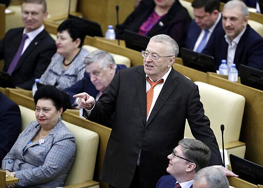 Russian Liberal Democratic Party leader Vladimir Zhirinovsky gestures while speaking during a session prior to vote on a third reading of constitutional amendments at the State Duma, the Lower House of the Russian Parliament in Moscow, Russia, Wednesday, March 11, 2020. The Russian parliament has approved a sweeping constitutional reform that will allow President Vladimir Putin to stay in power for another 12 years after his current term ends in 2024. Wednesday's vote was the third and final reading. (AP Photo/Pavel Golovkin)