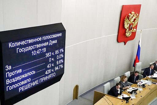 Russian lawmakers vote on a third reading of constitutional amendments at the State Duma, the Lower House of the Russian Parliament in Moscow, Russia, Wednesday, March 11, 2020. A vote on a third reading was a quick formality. A nationwide vote on the proposed amendments is set for April 22. (AP Photo/Pavel Golovkin)