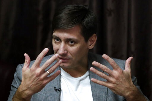 Russian opposition candidate Dmitry Gudkov gestures during his interview with the Associated Press in Moscow, Russia, Wednesday, March 11, 2020. Gudkov, a former lawmaker turned opposition politician, believes an early parliamentary election is likely, since he says the Kremlin would want the vote to be this year instead of next. "They're in a rush and want to (pass the proposed constitutional amendments) with the sitting parliament, which they fully control," Gudkov. (AP Photo/Pavel Golovkin)