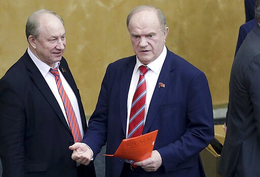 Russian Communist Party leader Gennady Zyuganov, right, gestures while speaking to lawmaker Valery Rashkin during a session prior to vote on a third reading of constitutional amendments at the State Duma, the Lower House of the Russian Parliament in Moscow, Russia, Wednesday, March 11, 2020. The Russian parliament has approved a sweeping constitutional reform that will allow President Vladimir Putin to stay in power for another 12 years after his current term ends in 2024. Wednesday's vote was the third and final reading. (AP Photo/Pavel Golovkin)