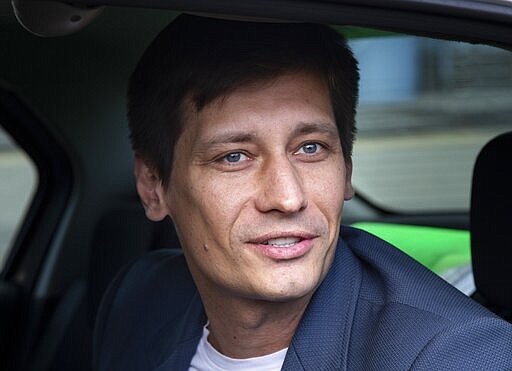 FILE - In this file photo taken on Tuesday, July 30, 2019, Russian opposition candidate Dmitry Gudkov speaks to journalists sitting inside a police car as he arrives to the court in Moscow, Russia. Gudkov, a former lawmaker turned opposition politician, believes an early parliamentary election is likely, the Kremlin would want the vote to be this year instead of next. (AP Photo/Alexander Zemlianichenko, File)
