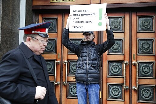 A member of the liberal Yabloko Party holds a poster reading: "You need to change the brain, not the constitution!" as he stages a one-man picket at the State Duma, the Lower House of the Russian Parliament in Moscow, Russia, Wednesday, March 11, 2020. The Russian parliament has approved a sweeping constitutional reform that will allow President Vladimir Putin to stay in power for another 12 years after his current term ends in 2024. Wednesday's vote was the third and final reading. (AP Photo/Pavel Golovkin)