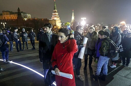 People lineup to attend a one person protest in front of the monument of the Prince Vladimir next to the Kremlin in Moscow, Russia, Wednesday, March 11, 2020. The constitutional reform passed by the Duma on Wednesday would allow Putin to run for presidency two more times after 2024. Before the national vote, it will be reviewed by Russia's Constitutional Court. (AP Photo/Pavel Golovkin)
