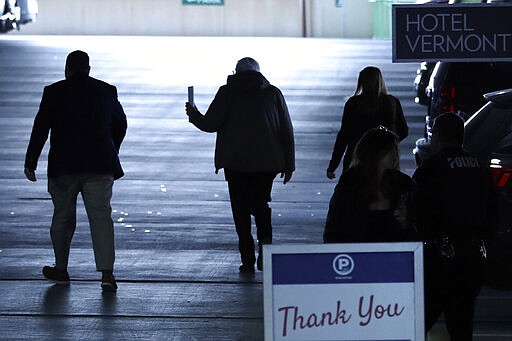 Democratic presidential candidate, Sen. Bernie Sanders, I-Vt., center, walks to his car after speaking to reporters on Wednesday, March 11, 2020, in Burlington, Vt. (AP Photo/Charles Krupa)