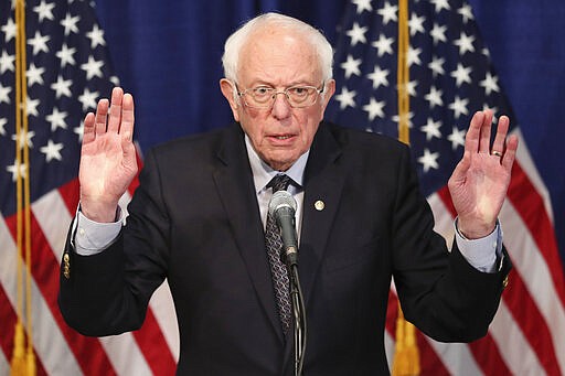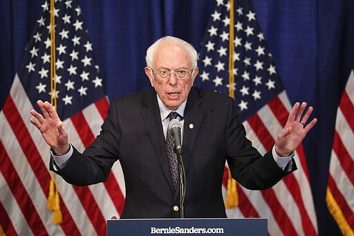 Democratic presidential candidate, Sen. Bernie Sanders, I-Vt., speaks to reporters on Wednesday, March 11, 2020, in Burlington, Vt. (AP Photo/Charles Krupa)