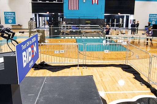 Workers take down chairs after a campaign rally for Democratic presidential candidate former Vice President Joe Biden was cancelled at Cuyahoga Community College Tuesday, March 10, 2020, in Cleveland, due to health concerns with the coronavirus. (AP Photo/Phil Long)