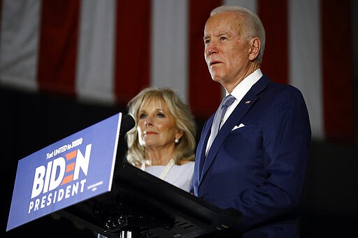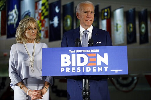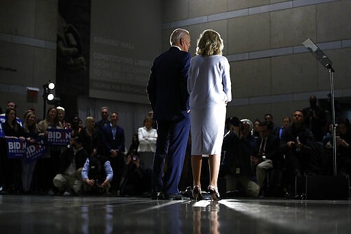 Democratic presidential candidate former Vice President Joe Biden, accompanied by his wife Jill, speaks to members of the press at the National Constitution Center in Philadelphia, Tuesday, March 10, 2020. (AP Photo/Matt Rourke)