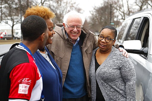 Democratic presidential candidate Sen. Bernie Sanders, I-Vt., visits custodian Davonta Bynes, from left, principal DaRhonda Evans-Stewart and social worker Kim Little outside a polling location at Warren E. Bow Elementary School in Detroit, Tuesday, March 10, 2020. (AP Photo/Paul Sancya)