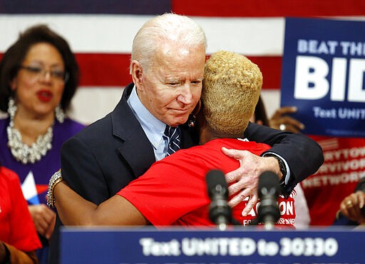 Democratic presidential candidate former Vice President Joe Biden hugs Crystal Turner of Columbus, Ohio, with Moms Demand Action during a campaign rally in Columbus, Ohio, Tuesday, March 10, 2020. (AP Photo/Paul Vernon)