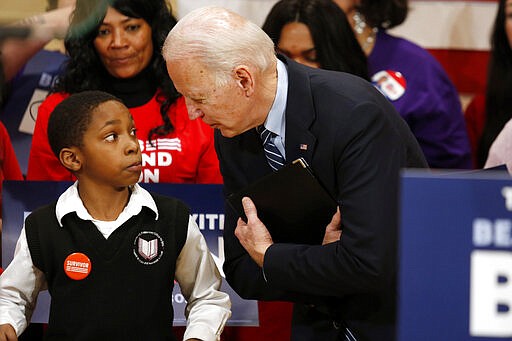 Democratic presidential candidate former Vice President Joe Biden, right, speaks with Deaunte Bell Jr., 11, of Columbus, Ohio, at a campaign event in Columbus, Ohio, Tuesday, March 10, 2020. (AP Photo/Paul Vernon)