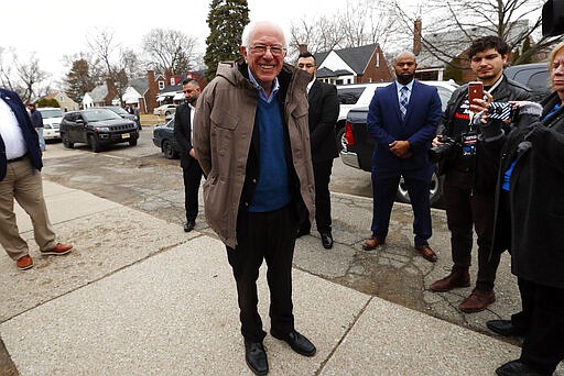 Democratic presidential candidate Sen. Bernie Sanders, I-Vt., visits outside a polling location at Warren E. Bow Elementary School in Detroit, Tuesday, March 10, 2020. (AP Photo/Paul Sancya)