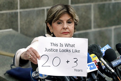 Attorney Gloria Allred holds a sign as she meets the press after Harvey Weinstein's sentencing, in New York, Wednesday, March 11, 2020. Weinstein was sentenced to 23 years in prison for rape and sexual assault. (AP Photo/Mark Lennihan)