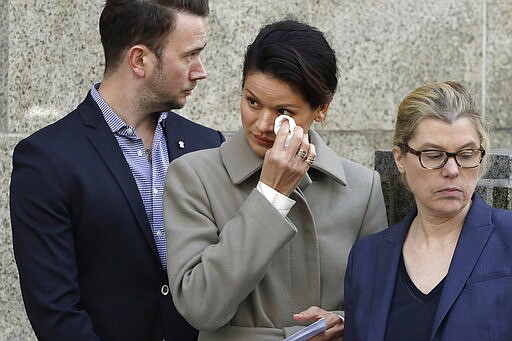 Tarale Wulff, center, wipes her eye before she speaks to the press after Harvey Weinstein's sentencing, in New York, Wednesday, March 11, 2020. Weinstein was sentenced to 23 years in prison for rape and sexual assault. During Weinstein's trial, Wulff testified that the one-time Hollywood titan raped her at his New York City apartment after luring her there in 2005 with promises of an audition for a film role. (AP Photo/Mark Lennihan)