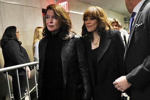 Annabella Sciorra, left, and Rosie Perez, leave court after the sentencing of Harvey Weinstein, in New York, Wednesday, March 11, 2020. (AP Photo/Richard Drew)