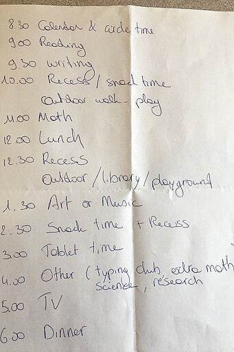 This photo provided by Natasja Billiau, shows a handwritten school schedule she devised for the first time to homeschool her 5-year-old daughter and 8-year-old son Thursday, March 12, 2020, after Seattle schools closed due to the coronavirus. Billiau's husband is also working from home and they family is trying to pack up their house for a move in two weeks. For most people, the new coronavirus causes only mild or moderate symptoms. For some it can cause more severe illness. (Natasja Billiau via AP)