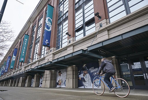 A bicyclist rides past T-Mobile Park, Wednesday, March 11, 2020, in Seattle, where baseball's Seattle Mariners plays home games. In efforts to slow the spread of the COVID-19 coronavirus, Washington State Gov. Jay Inslee announced a ban on large public gatherings in three counties in the metro Seattle area. That decision impacts the Seattle Mariners, Seattle Sounders, and the XFL's Seattle Dragons home games. (AP Photo/Stephen Brashear)