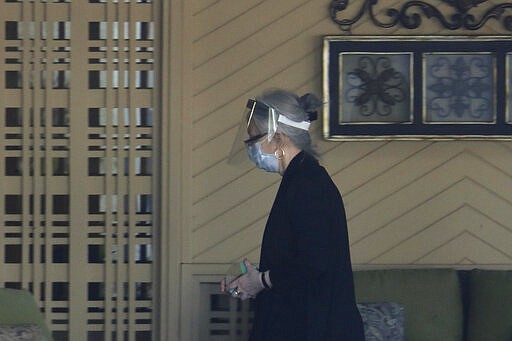 A worker wears a mask and a protective face shield as she walks into the Life Care Center in Kirkland, Wash. Monday, March 9, 2020, near Seattle. The nursing home is at the center of the outbreak of the COVID-19 coronavirus in Washington state. (AP Photo/Ted S. Warren)