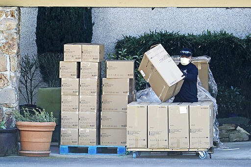 A worker at the Life Care Center in Kirkland, Wash., wears a mask as he stacks newly arrived boxes of gloves, gowns, and other protective gear on a cart, Monday, March 9, 2020, near Seattle. The nursing home is at the center of the outbreak of the new coronavirus in Washington state. (AP Photo/Ted S. Warren)