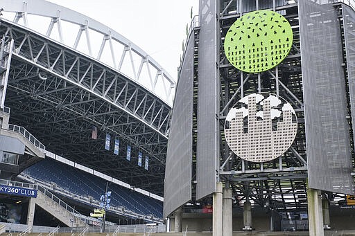 CenturyLink Field, where MLS soccer's Seattle Sounders and the XFL's Seattle Dragons play home games, sits empty, Wednesday, March 11, 2020, in Seattle. In efforts to slow the spread of the COVID-19 coronavirus, Washington State Gov. Jay Inslee announced a ban on large public gatherings in three counties in the metro Seattle area. That decision impacts the Seattle Mariners, Seattle Sounders, and the XFL's Seattle Dragons home games. (AP Photo/Stephen Brashear)