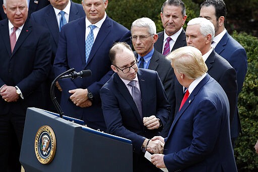 Trump was surrounded by several retail and health care industry executives on Friday as he announced he was declaring the virus outbreak a national emergency.