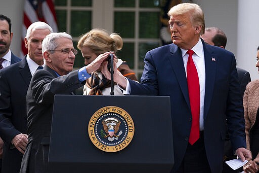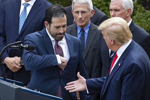 WASHINGTON (AP) — President Donald Trump, a self-described germaphobe, can’t seem to stop shaking hands -- even in the midst of this coronavirus pandemic.