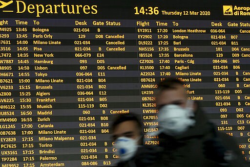 Delta said Thursday that it will suspend seven routes between the U.S. and Europe after Friday. United Airlines said it will fly its normal schedule to Europe through March 19, then cut back from an average of 63 flights a day to about 34 a day while monitoring demand. Delta, United and American all said they were capping fares on flights from Europe to the U.S. They are also waiving fees for changing or canceling tickets through April 30.