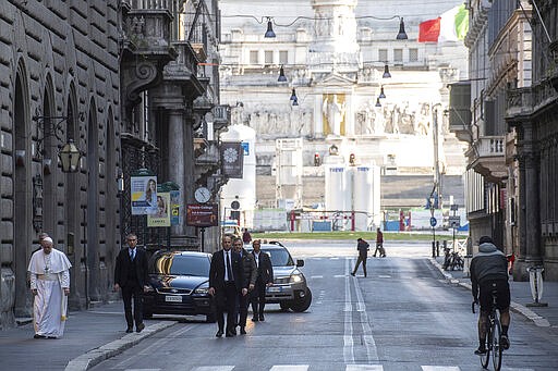 VATICAN CITY (AP) — Pope Francis left the Vatican to make a surprise visit Sunday to two churches in Rome to pray for the end of the coronavirus pandemic — a move that came even as Italian health authorities insisted people stay home as much as possible to limit contagion in the heart of Europe's outbreak.