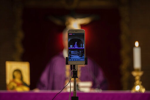 Catholic priest Catholic priest Jesus Higueras from the Santa Maria de Cana parish is seen on a smartphone during a live video streamed mass in Pozuelo de Alarcon, outskirts Madrid, Spain, Sunday, March 15, 2020. Pope Francis has praised people for their continuing efforts to help vulnerable communities, including the poor and the homeless, amid the coronavirus pandemic. The vast majority of people recover from the COVID-19. According to the World Health Organization, most people recover in about two to six weeks, depending on the severity of the illness. (AP Photo/Bernat Armangue)