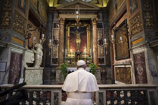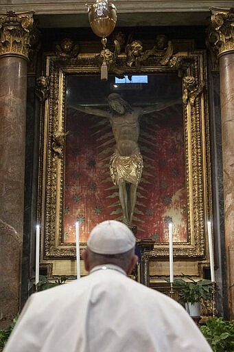 Pope Francis prays in S. Marcello al Corso church, in front of a miraculous crucifix that in 1552 was carried in a procession around Rome to stop the great plague, Sunday, March 15, 2020. For most people, the new coronavirus causes only mild or moderate symptoms. For some, it can cause more severe illness, especially in older adults and people with existing health problems. (Vatican News via AP)