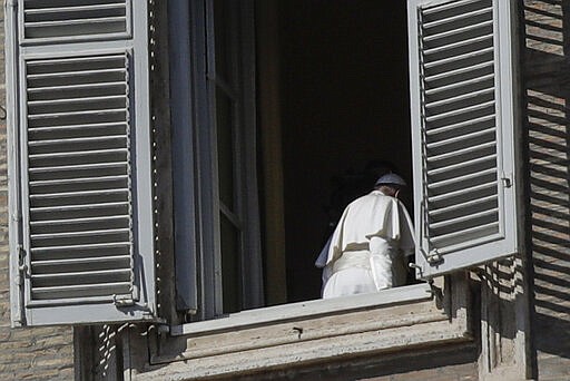 Pope Francis leaves after delivering his blessing from his studio window overlooking St. Peter's Square at the Vatican, Sunday March 15, 2020. For most people, the new coronavirus causes only mild or moderate symptoms. For some, it can cause more severe illness, especially in older adults and people with existing health problems. (AP Photo/Alessandra Tarantino)