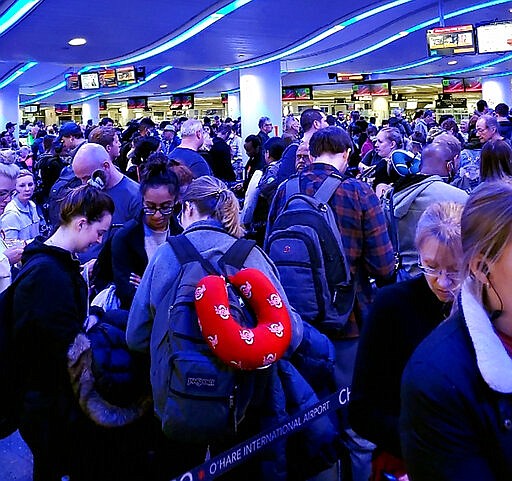 Katy Rogers spent four hours Saturday at O'Hare in a tightly packed space with students, a basketball team, musicians and older people in wheelchairs.