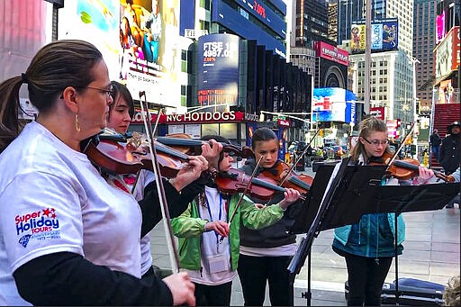 The young musicians from the Alliance Charter Academy in Oregon City, Oregon, got word their planned Carnegie Hall performance had been canceled just before they were scheduled to leave. Some of them decided to come anyway, and took their stringed instruments to Times Square, playing for the few hardy souls still out and about.