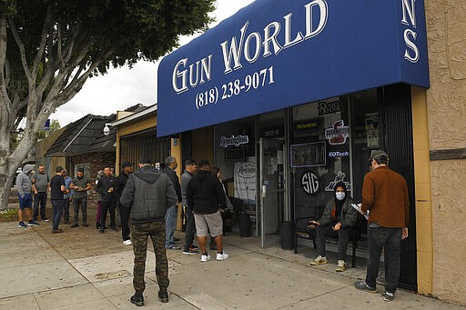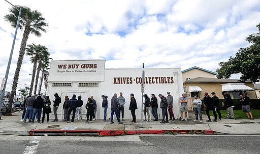 People wait in a line to enter a gun store in Culver City, Calif., Sunday, March 15, 2020. Coronavirus concerns have led to consumer panic buying of grocery staples, and now gun stores are seeing a similar run on weapons and ammunition as panic intensifies. (AP Photo/Ringo H.W. Chiu)