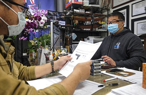 David Liu, right, owner of a gun store, takes an order from a customer in Arcadia, Calif., Sunday, March 15, 2020. Coronavirus concerns have led to consumer panic buying of grocery staples and now gun stores are seeing a run on weapons and ammunition as panic intensifies. (AP Photo/Ringo H.W. Chiu)