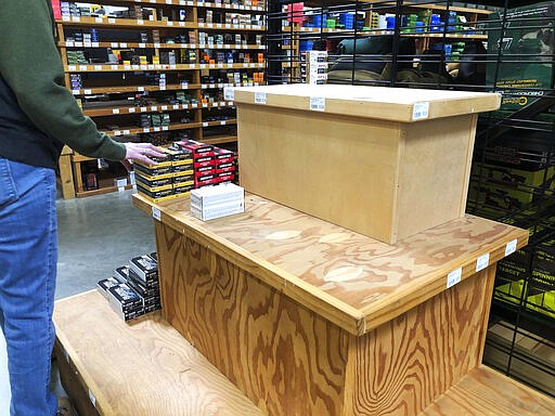 This image taken March 14, 2020, shows a nearly empty display shelf for ammunition at the Sportsmen's Warehouse in Meridian, Idaho. A sign at the store alerted customers that the store was limiting the number of firearms and ammunition that people could buy in a given day. (AP Photo/Lisa Marie Pane)