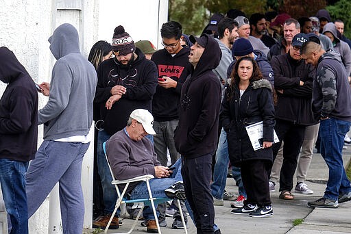 Gun store patrons wait in line, Sunday, March 15, 2020, in Burbank, Calif. Consumers are buying all kinds of goods in large quantities amid coronavirus concerns, putting pressure on inventories. Some people in line simply wanted to stock up on ammunition, while others said they were preparing in case their homes get invaded for food and other necessities. (AP Photo/Mark J. Terrill)