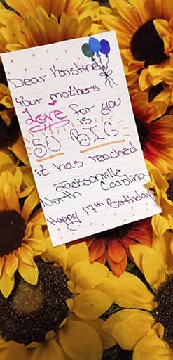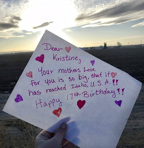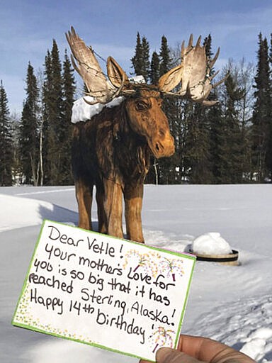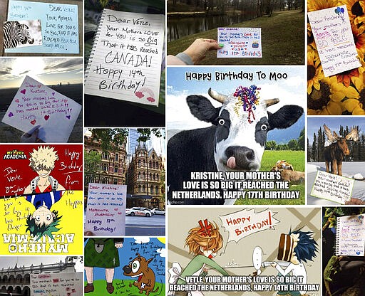 There’s one with the photo of a tiny, florescent green iguana from Jacksonville, North Carolina and another with the giant brown moose from Sterling, Alaska. And one is a cartoon of a man in a kilt next to his dog from Scotland. Several include landmarks and landscapes, a sunset from Idaho, the “Plaza de Armas” square of Veracruz, Mexico and a dog on a beach in Melbourne, Australia. One with a cartoon cow that reads: “Dear Kristine, your mother’s love is so big that this ‘moooooosage’ came from Alberta, Canada.”