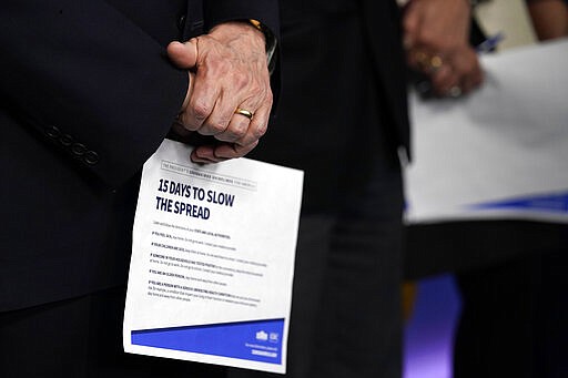 Vice President Mike Pence holds a information sheet during a press briefing with the coronavirus task force, in the Brady press briefing room at the White House, Monday, March 16, 2020, in Washington. (AP Photo/Evan Vucci)