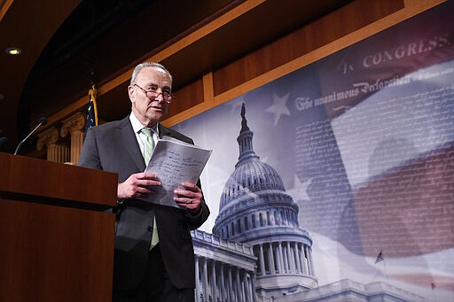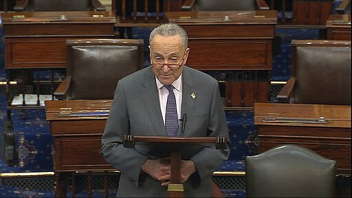 In this image from video, Sen. Chuck Schumer, D-N.Y., speaks on the Senate floor at the U.S. Capitol in Washington, Wednesday, March 18, 2020. (Senate Television via AP)