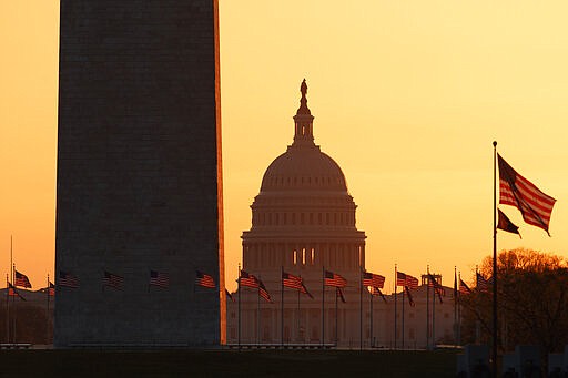 The Washington Monument and the U.S. Capitol are seen in Washington, at sunrise Wednesday, March 18, 2020. The White House has sent Congress an emergency $46 billion spending request for coronavirus-related funding this year. (AP Photo/Carolyn Kaster)