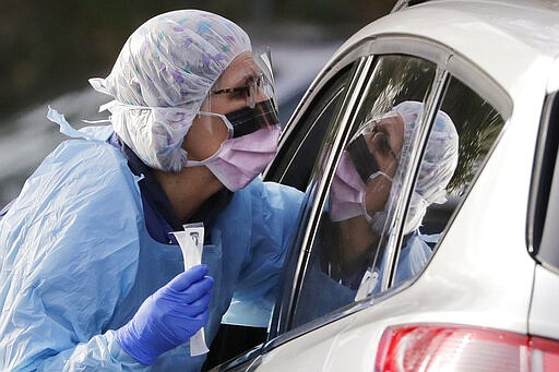 FILE - In this March 13, 2020, file photo, a nurse at a drive up COVID-19 coronavirus testing station, set up by the University of Washington Medical Center, holds a swab used to take a sample from the nose of a person in their car in Seattle. The federal government is rushing protective equipment to states for medical workers who will be on the front lines of the growing coronavirus pandemic. Washington state has received at least two shipments and needs more. At least in two other states, promised deliveries are falling far short of requests and even include expired items. (AP Photo/Ted S. Warren, File)