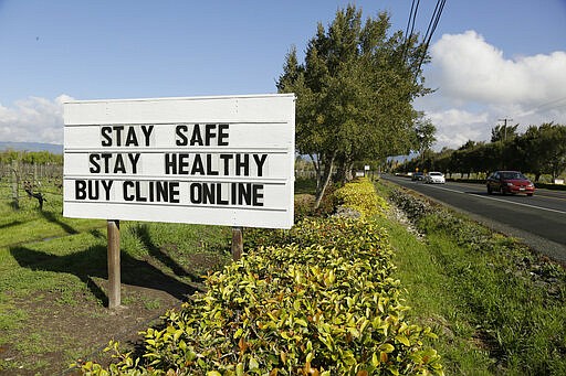 A sign outside the Domaine Carneros winery tells people they are closed for tastings and tours, but open for purchases and wine club pickups Thursday, March 19, 2020, in Napa, Calif. As worries about the spread of the coronavirus confine millions of Californians to their homes, concern is growing about those who have no homes in which to shelter. (AP Photo/Eric Risberg)